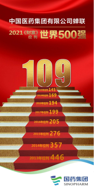 2021年8月2日,《财富》中文网发布了2021年“世界500强”榜单,中国医药集团有限公司(以下简称“国药集团”)位列第109位,较上年提升36位。